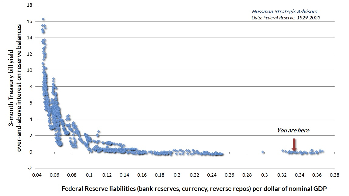 C’est ça. La Fed a créé une montagne de passifs, et quelqu’un doit les détenir. Chaque fois que quelqu’un devient rhapsodique à propos de tout « l’argent sur la touche » qui attend « d’entrer » dans un autre marché, il vous dit essentiellement qu’il n’a pas appris comment fonctionne l’équilibre. Chaque titre émis, même la monnaie de base, doit être détenu par quelqu’un jusqu’à ce qu’il soit retiré.