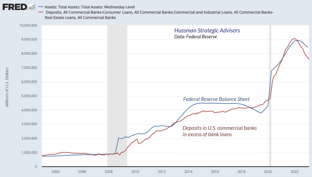 Conceptuellement, vous pouvez considérer votre dépôt bancaire comme étant « adossé » soit à des réserves que votre banque détient en dépôt auprès de la Fed, soit à une reconnaissance de dette que votre banque a reçue en échange d’un prêt qu’elle a consenti avec votre argent. En injectant des trillions de dollars de réserves dans le système bancaire, l’assouplissement quantitatif a également poussé des trillions de dollars de dépôts dans le système bancaire.