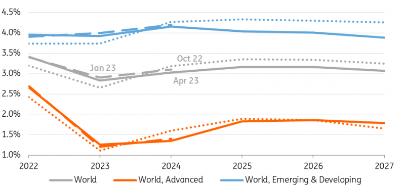 Les dernières Perspectives de l’économie mondiale du Fonds monétaire international (FMI) ont mis en évidence certains domaines de prudence dans l’économie mondiale, en mettant l’accent sur les risques liés à l’instabilité bancaire, à la persistance de l’inflation sous-jacente et à la hausse des niveaux de la dette publique. Le Fonds a légèrement abaissé ses prévisions de croissance mondiale pour 2023 et 2024 de 0,1 % par rapport à sa précédente mise à jour de janvier, principalement en raison des révisions à la baisse des économies des marchés émergents (ME) ces derniers mois, tandis que les perspectives pour les marchés développés (DM) s’est en fait légèrement améliorée depuis janvier. La croissance mondiale devrait maintenant ralentir de 3,4 % en 2022 à 2,8 % en 2023, avant de remonter légèrement à 3,0 % en 2024.