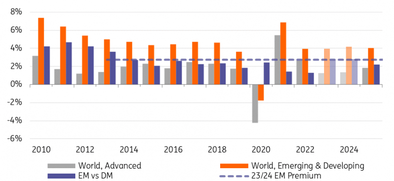 En faisant un zoom arrière, le net ralentissement de la croissance mondiale attendu en 2023 par rapport à 2022 est largement tiré par le ralentissement de la croissance des économies des DM, en particulier en Europe. Même si la croissance des marchés émergents devrait rester inférieure à celle de la majeure partie de la dernière décennie (moyenne de 4 % en glissement annuel au cours des trois prochaines années), elle devrait être plus résistante que la croissance des marchés danois. Cela signifie un avantage de croissance moyen pour les économies émergentes par rapport aux marchés développés en 2023/24 d’un peu plus de 2,7 %, le plus élevé depuis 2013.