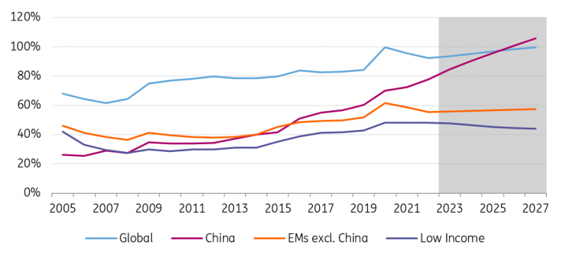 Malgré moins de signes de croissance à grande échelle des niveaux de la dette publique des marchés émergents, le FMI a continué de faire part de ses inquiétudes quant au risque de nouvelles crises de la dette dans les pays à faible revenu. Les niveaux de la dette publique devraient rester supérieurs aux moyennes d’avant la pandémie, tandis que les coûts du service de la dette devraient augmenter dans un environnement de taux d’intérêt plus élevés. Dans le même temps, les mesures de soutien de l’ère de la pandémie telles que l’Initiative de suspension du service de la dette (DSSI) ont pris fin. Le FMI estime que 56 % des pays en développement à faible revenu sont déjà en situation de surendettement ou à haut risque, tandis que 25 % des économies des marchés émergents sont estimées à haut risque.