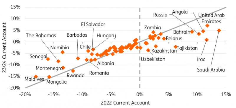 À l’autre extrémité de l’échelle, il devrait y avoir une certaine amélioration des larges déficits des comptes courants observés en 2022 pour de nombreux importateurs de matières premières. La Hongrie se distingue en voyant probablement un resserrement significatif de son déficit courant, compte tenu de sa sensibilité aux prix du gaz. Le FMI prévoit également des améliorations en Namibie et au Sénégal en Afrique, ainsi qu’aux Bahamas, au Chili et au Salvador en Amérique latine.
