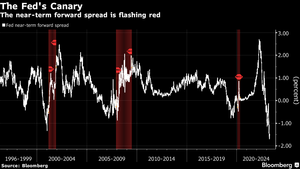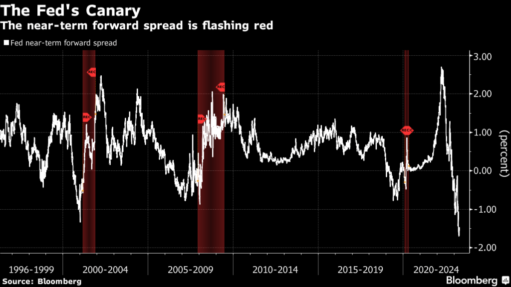 En juin 2022, j’ai examiné l’indicateur de récession préféré du président de la Réserve fédérale Jay Powell: l’écart entre les bons du Trésor à trois mois et le taux anticipé à trois mois dans 18 mois. Le niveau de spread, que Powell a vanté lors d’une conférence de presse postérieure à la décision sur les taux, était si élevé qu’il dépassait de près de deux points de pourcentage un signal de récession- cela rendait toute idée de contraction économique impossible. Maintenant, c’est si profondément négatif qu’une récession semble presque inévitable.