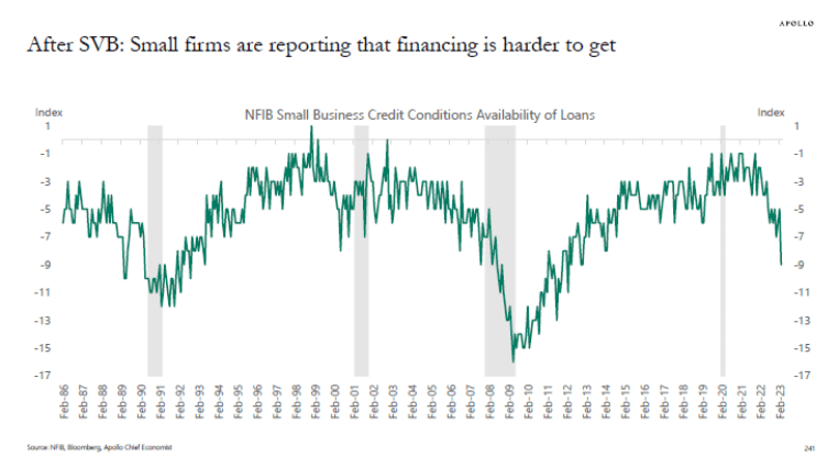 Par exemple, un graphique de Torsten Slok d’Apollo Global Management basé sur une récente enquête de la Fédération nationale des entreprises indépendantes a montré qu’une crise du crédit entraînait déjà les pires conditions pour les petites entreprises depuis une décennie.