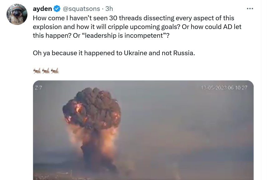 Ceci pour illustrer le prochain point que je souhaite soulever, à savoir qu’il y a beaucoup de « biais de récence » qui entre dans les attaques d’hier contre la flotte aérienne russe. Soudain, il y a de la tristesse et l’essaim typique et attendu de « trolls inquiets », etc. Mais beaucoup de gens oublient rapidement à quel point les dégâts que la Russie inflige quotidiennement à l’Ukraine sont considérables. L’estimation du coût de la frappe susmentionnée de Khmelnitsky à elle seule serait de plus de 500 millions de dollars, selon Basurin de la RPD et d’autres sources.