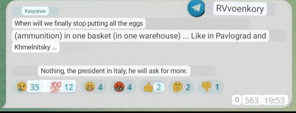 Il convient de noter que des rapports de panique se répandent sur les réseaux sociaux ukrainiens selon lesquels, lors de la détonation d’un dépôt de munitions à Khmelnytsky, un important lot de munitions de chars britanniques à l’uranium appauvri, récemment importé en Ukraine avec des missiles Storm Shadow, a également été détruit.