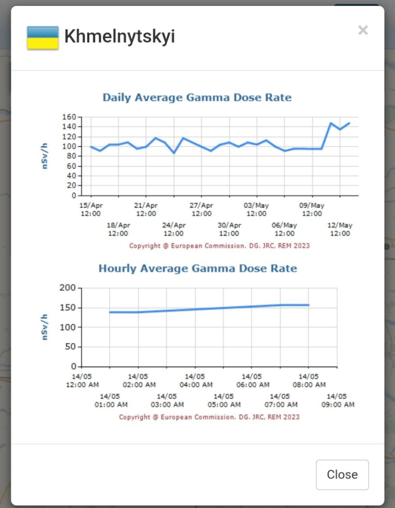 Un pic clair de rayonnement gamma a été détecté à Khmelnitsky vers le 12 mai, l’émission continuant d’augmenter le lendemain et restant au niveau élevé par la suite.