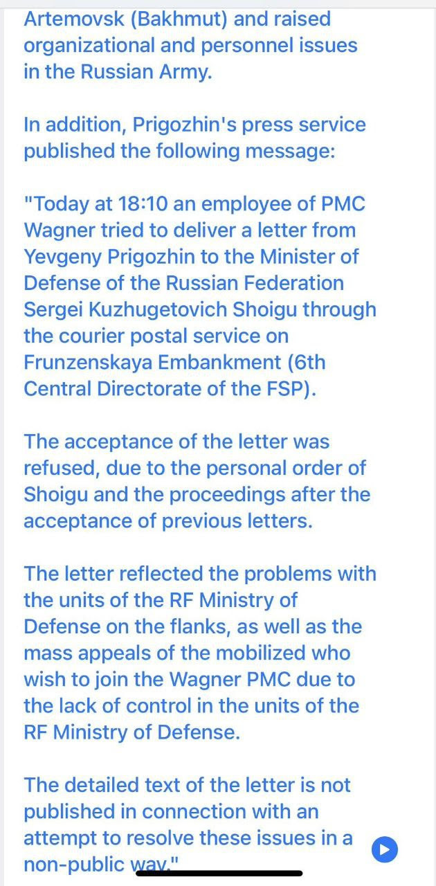 Sur ce sujet, quelques mises à jour. Prigozhin continue de revendiquer des frictions majeures avec le Ministère de la défense russe: