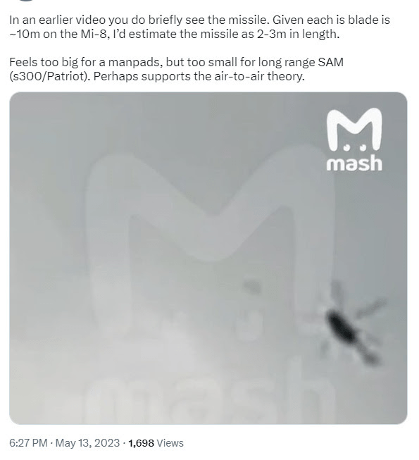 Les missiles S-300 et BUK mesurent plus de 7 mètres de long. Cela signifie que si les pales du rotor de l’hélicoptère mesurent 10 m sur la photo ci-dessus, le missile devrait apparaître presque aussi long que les pales. Pourtant, le petit blip semble 1/3 de la taille, ce qui, pour moi, indiquerait en fait un Aim-120 de la plate-forme NASAMs/SLAMRAAM. Il est certainement trop grand pour Manpad, qui serait presque invisible à la caméra car ils sont très petits.