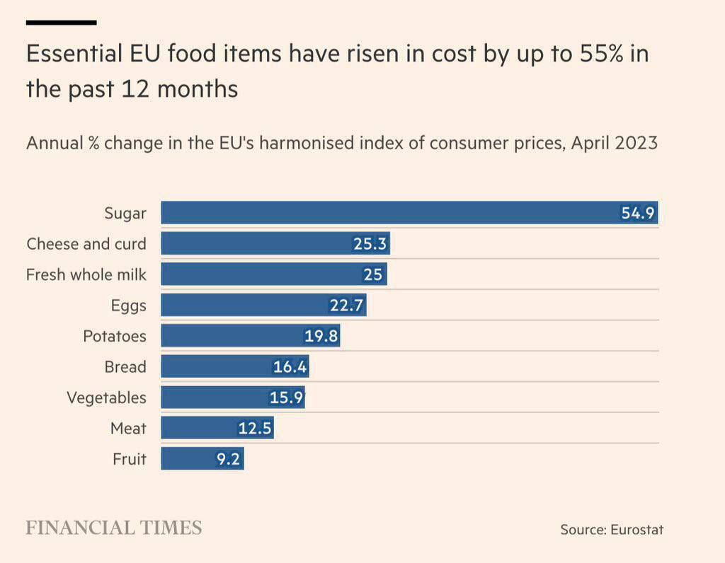 Inflation des produits alimentaires dans l’UE d’avril 2022 à avril 2023, selon Bloomberg via le FT