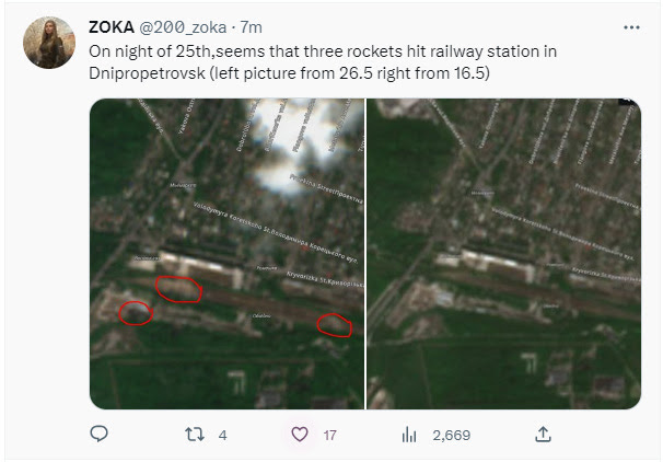 Et des photos satellites d’une frappe dans une gare de Dnipropetrovsk où l’Ukraine déchargeait du matériel. Je crois qu’il existe des photos plus claires, mais cette capture d’écran avec la description était plus pratique :