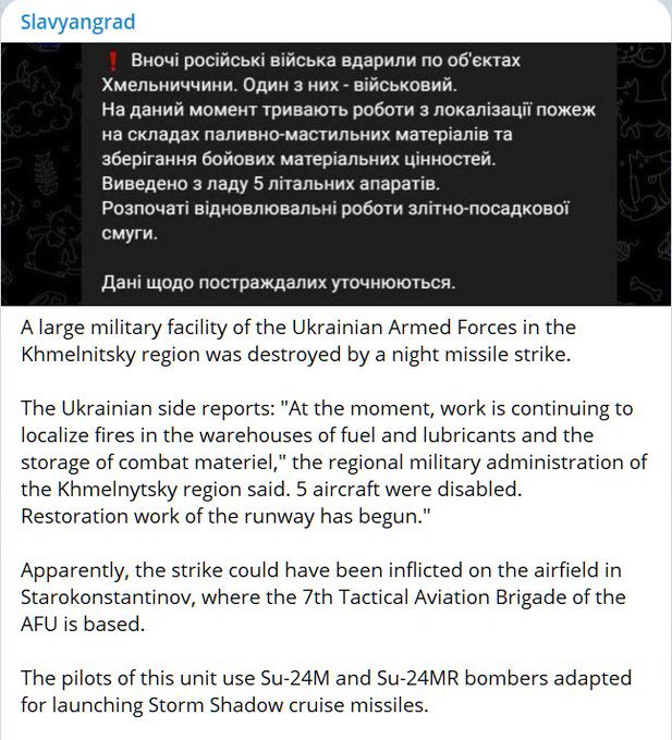 Maintenant, depuis les frappes de la nuit dernière, des rapports font état de dommages extrêmement paralysants dans les zones critiques de l’AFU. Les plus dommageables sont les rapports selon lesquels des missiles russes ont anéanti un aéroport dans la région de Khmelnitsky, où étaient hébergés les cinq Su-24 équipés de Storm Shadows britanniques :