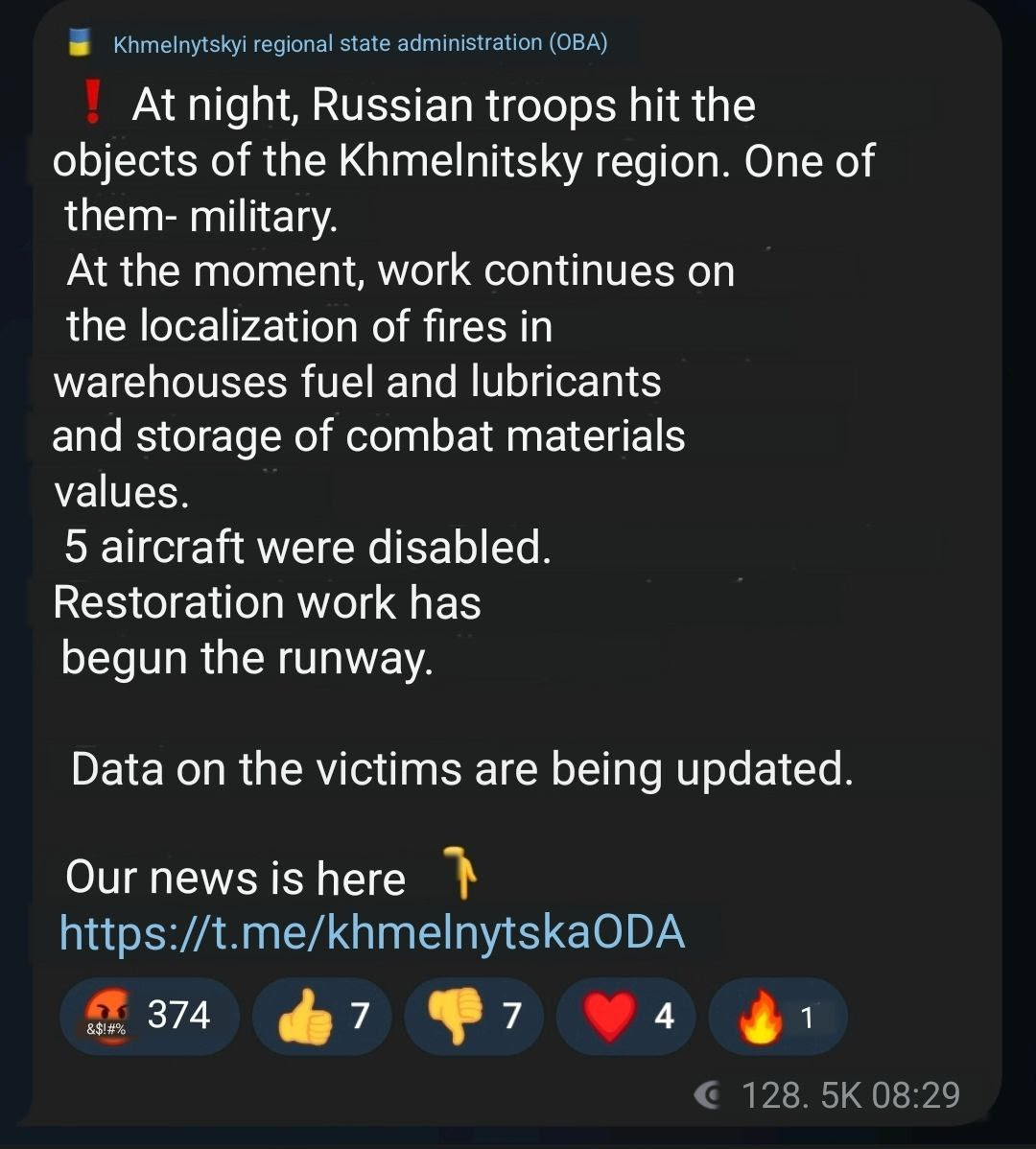 ️ Sur la frappe de la base aérienne dans la région de #Khmelnitsky ️