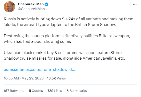 Cela inclut même le ministre de la Défense Reznikov accusé par des chaînes ukrainiennes en colère d’avoir divulgué par inadvertance l’emplacement secret des Su-24 armés de Storm-Shadow lorsqu’il a récemment publié un message vantant montrant une photo de Su-24 avec une Storm Shadow attachée sous ses ailes. . Le problème est que le message contenait l’emblème de la 7e escadre d’aviation tactique stationnée à Starokonstantinov dans la région de Khmelnitsky. Alors, a-t-il révélé la position de la base britannique secrète ou la Russie connaissait-elle déjà son emplacement ?