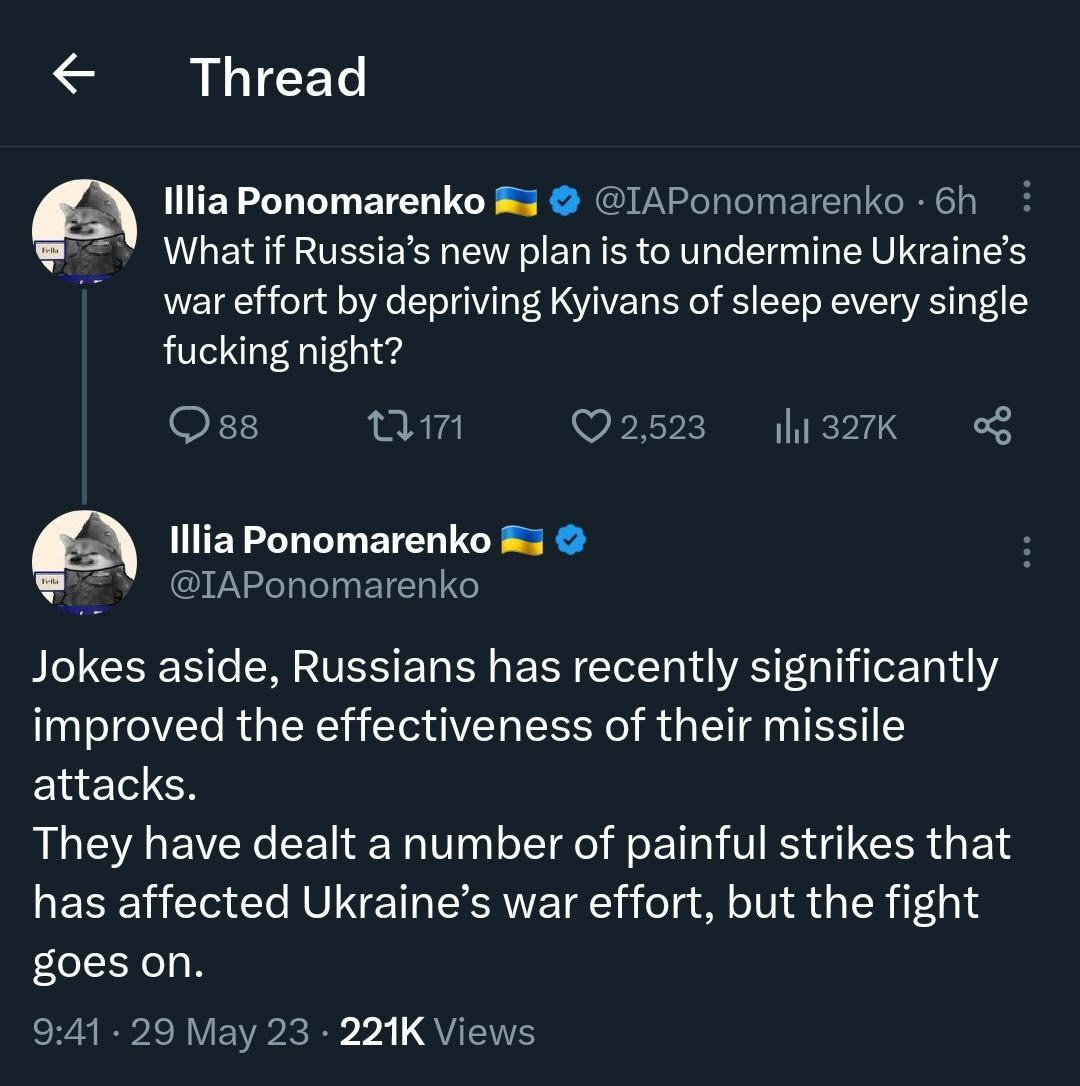 D’autres personnalités ukrainiennes de premier plan reconnaissent que les nouvelles frappes russes ont causé des revers majeurs. Par exemple, Illia Ponomarenko, la grande gueule dont je venais de couvrir l’article apologiste nazi dans le dernier rapport, a écrit ce qui suit :