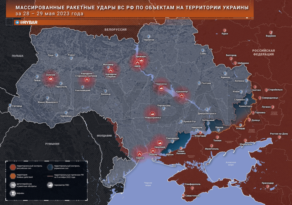 carte de Rybar de toutes les frappes de la nuit dernière est la suivante