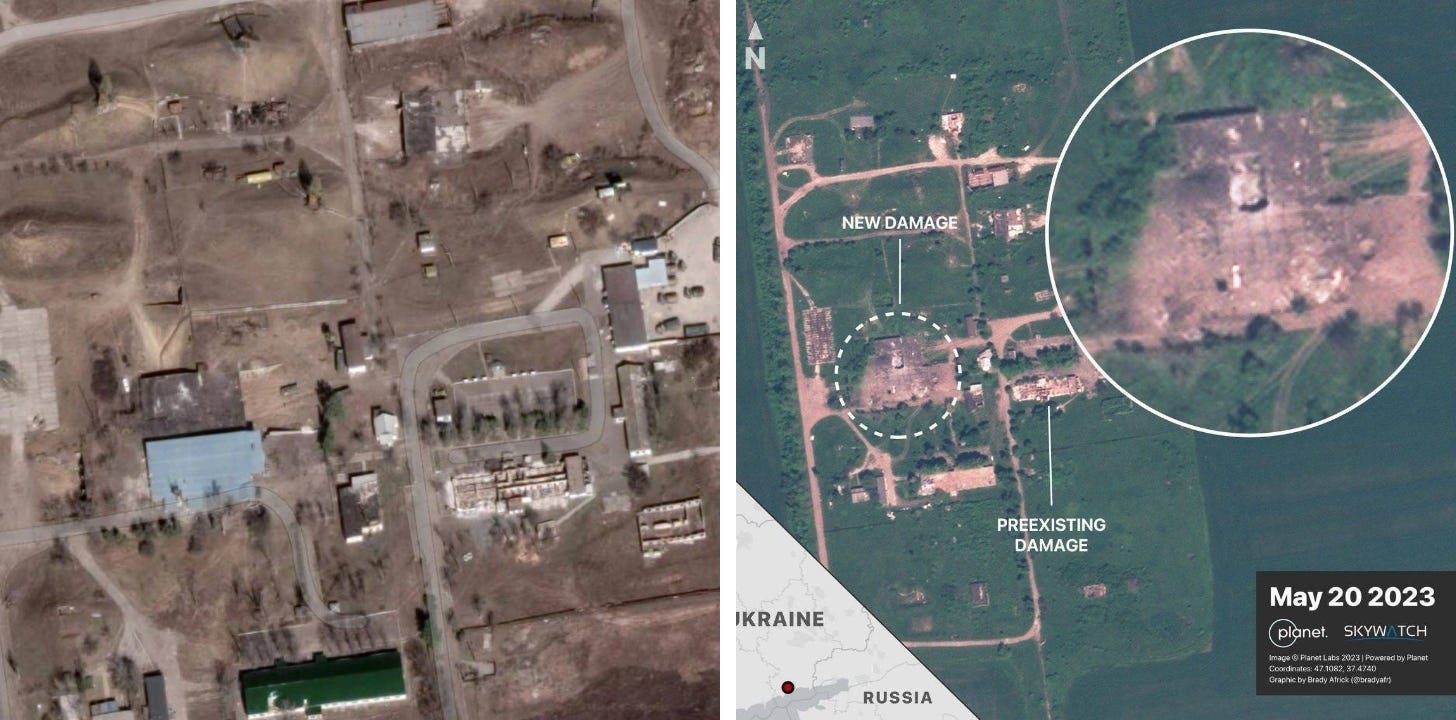 Cependant, il y avait une série de photos satellites montrant un prétendu coup de Storm Shadow sur un bunker souterrain près de Berdiansk :