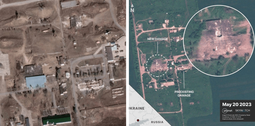 Dans l’image du 18 mai, par rapport à l’image du 15 mai, il y a des points d’arrivée distincts avec un rayon de plusieurs dizaines de mètres le long d’un parking en béton à côté de la position creusée du système de défense aérienne, ainsi que directement dans un des positions, qui, apparemment, sont les emplacements du MIM-104F Patriot PAC-3 .
