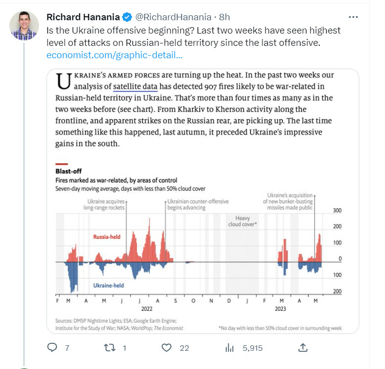 Tout cela nous amène au thème de « l’offensive à venir ». J’utilise des citations aériennes parce que je suis personnellement encore sceptique quant à la capacité de l’Ukraine à lancer la légendaire offensive, et encore moins à réaliser quoi que ce soit avec, du fait que la Russie a dévasté toutes ses zones de rassemblement, retardé ses munitions et sa logistique de plusieurs mois.
