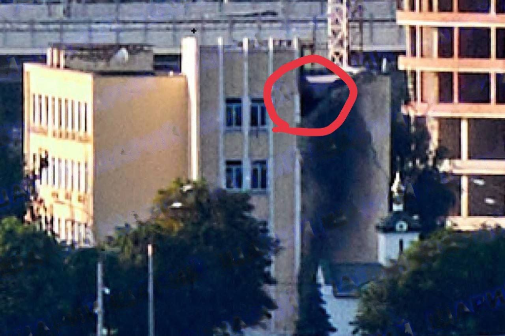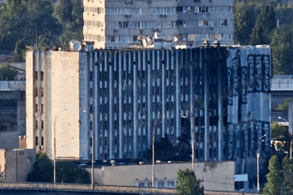 Notez comment le QG de GUR lui-même, ses plus gros dégâts visibles n’apparaissent pas en haut, d’où vous vous attendriez à ce qu’un missile arrive, mais plutôt un ensemble de fenêtres beaucoup plus bas sur ce qui ressemble au 4ème ou 5ème étage