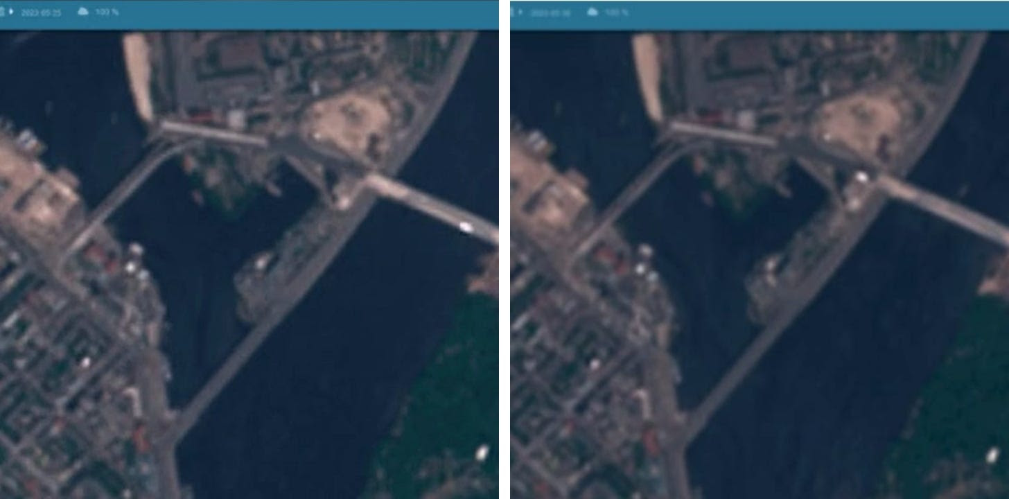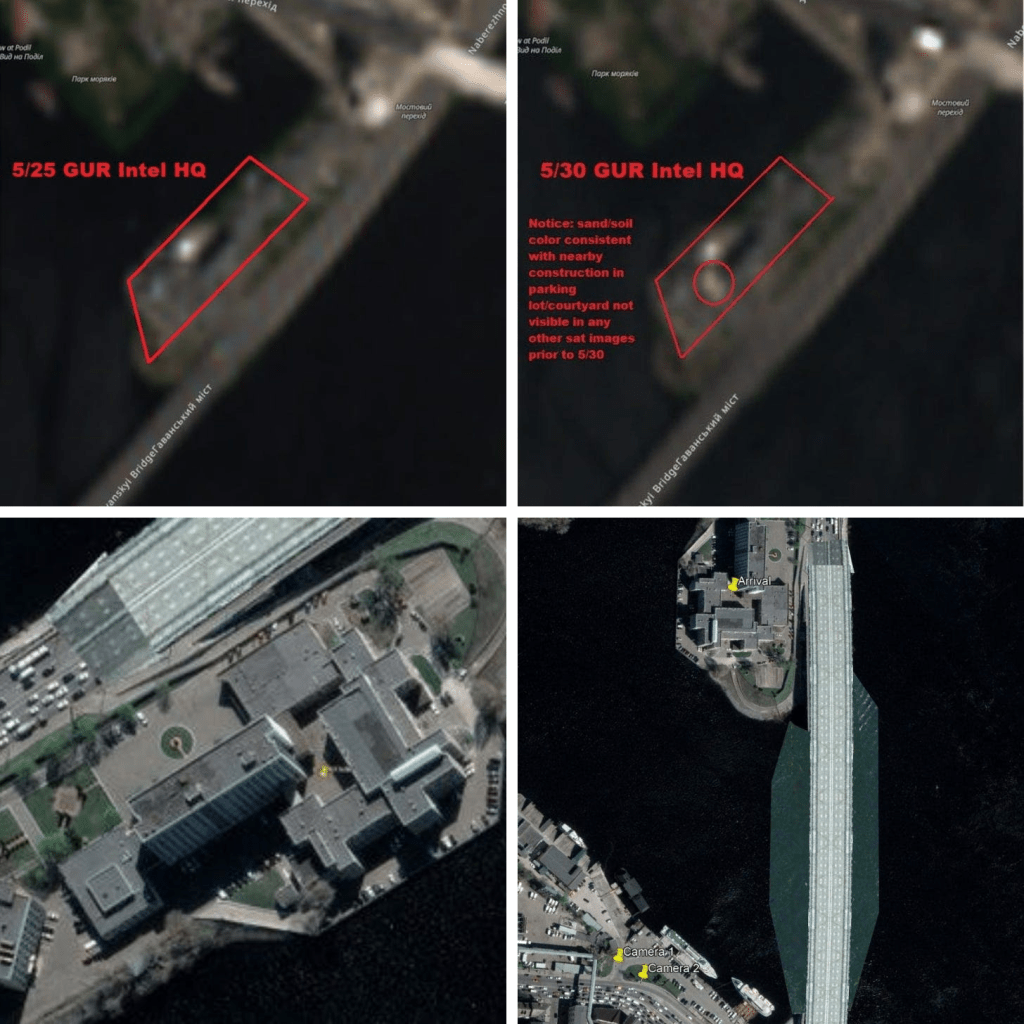 Photo à gauche est 5/25, à droite est 5/30. Lorsque vous regardez de près, la différence est l’apparition d’une zone éclaircie juste au point du bâtiment du QG de GUR que beaucoup interprètent comme étant une « terre retournée » ou un grand trou dans le sol.