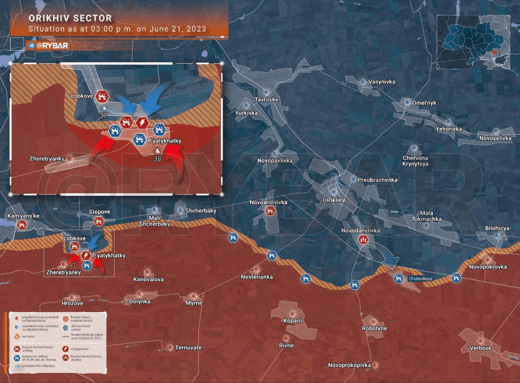 Les forces russes du 429e régiment de la 19e division de fusiliers motorisés de la 58e armée du district militaire du sud ont même entièrement éliminé la 128e brigade ukrainienne d’assaut de montagne de Pyatikhatki, ce qui signifie que sur ce front d’Orekhov, l’Ukraine a été littéralement repoussée sur la ligne de départ , et n’a même pas réalisé les gains minimes que le groupement oriental autour de Velyka Novosilka a réussi.