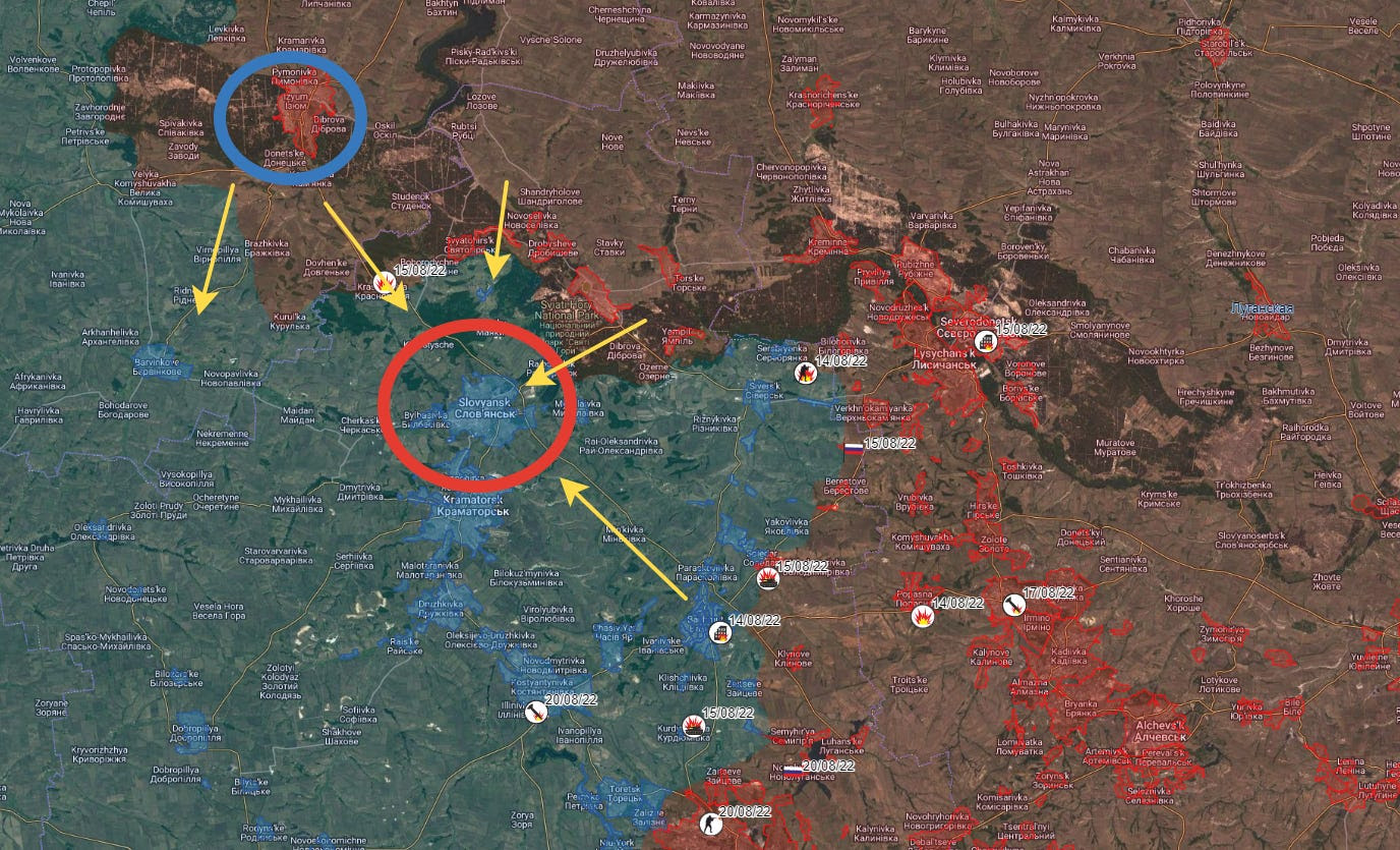 C’était tout l’intérêt derrière l’objectif initial de la Russie, où ils se sont approchés de Slaviansk depuis la direction d’Izyum (NW) ainsi que de Lyman vers le NE. Voici à quoi cela ressemblait avant l’offensive de Kharkov de l’automne dernier :