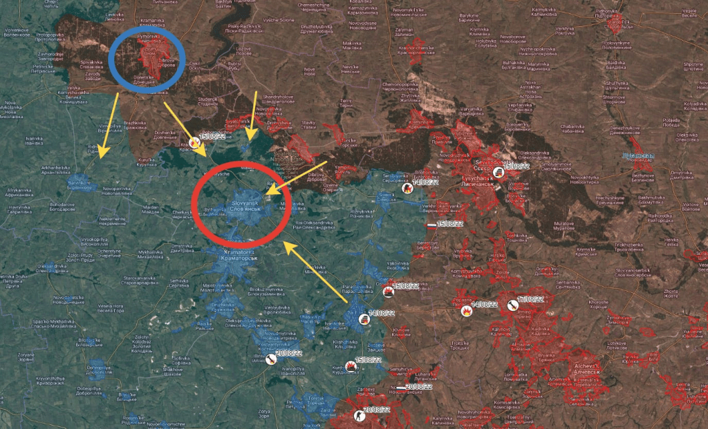 Peut-être est-il possible de l’engloutir lentement depuis le sud, en prenant Konstantinovka, Druzkhovka, puis Kramatorsk, mais il paraîtrait beaucoup plus simple d’utiliser la méthode originale qui ferait tomber le reste de la zone dans un chaudron géant. Partir du sud ne serait qu’une marche pénible à travers les régions les plus denses et les plus fortifiées de l’AFU.