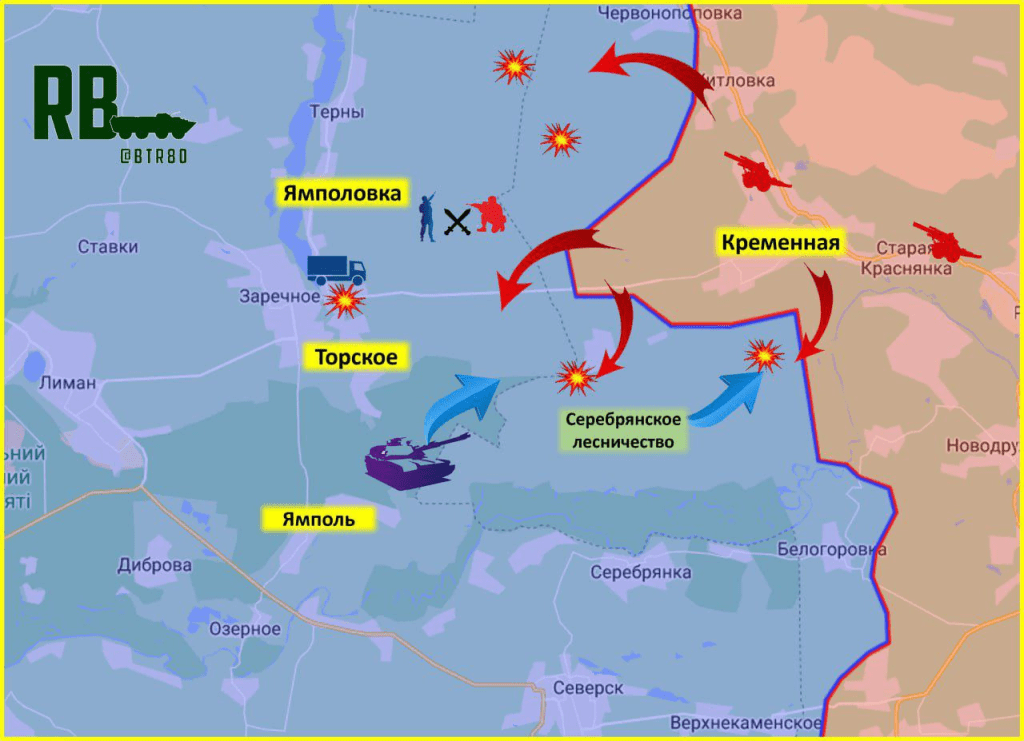 Mais maintenant, les unités russes ont fait des progrès notables à la fois à l’extrémité sud de ce front, dans la direction de Kremennaya, et à l’extrémité nord susmentionnée près de Kupyansk. Kremennaya à Torskoe illustré ci-dessous :