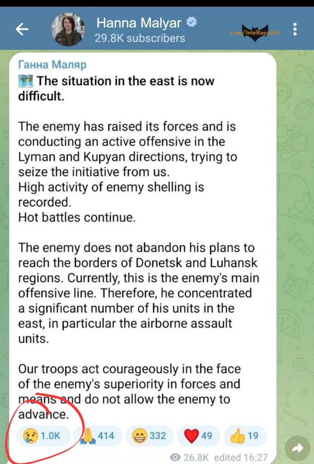 Selon certaines informations, un combat a commencé pour la colonie de Petropavlovka (c’est au nord de Kupyansk), les forces russes venant de la direction de Sinkovka.