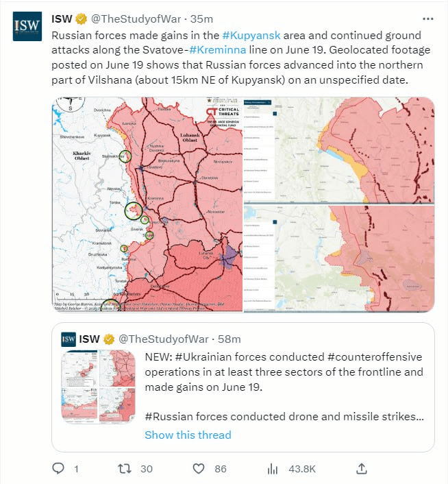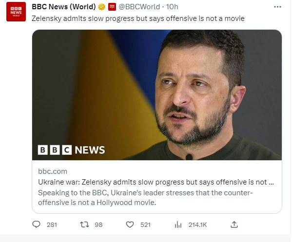 Rappel, j’avais récemment posté une interview de lui début juin où il déclarait qu’il faudrait 10 jours pour faire de grandes percées. L’offensive, qui a commencé le 4 juin, approche maintenant de son 20e jour.