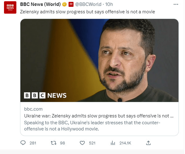 Zelensky a finalement admis dans une interview à la BBC que l’offensive s’était enlisée: