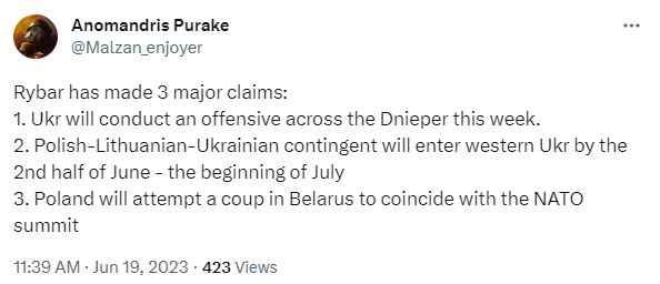 Maintenant, en raison de l’échec de la poussée principale, Rybar, entre autres, pense que l’Occident pourrait être en train de chauffer les choses entre la Pologne/l’OTAN et la Biélorussie :