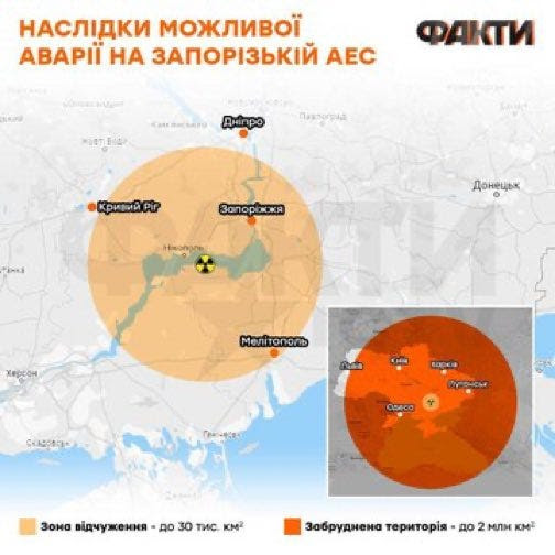 Il affirme effrontément que la Russie a carrément « miné » le sous-sol de la centrale nucléaire et qu’une catastrophe pourrait bientôt créer une zone d’exclusion de 30 km de large, qui, selon la carte, monte commodément jusqu’à Melitopol à travers lequel passe l’artère principale du pont terrestre de Crimée en Russie.
