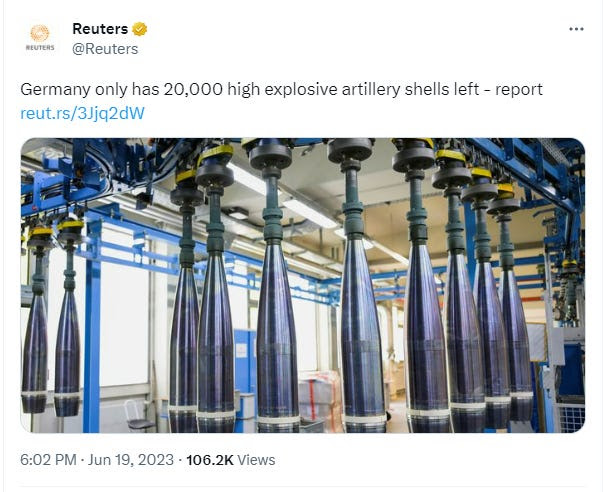 Mais l’Allemagne a confirmé qu’il ne lui restait plus que 20 000 obus, ce qui est suffisant pour une utilisation modérée d’une journée pour la Russie.