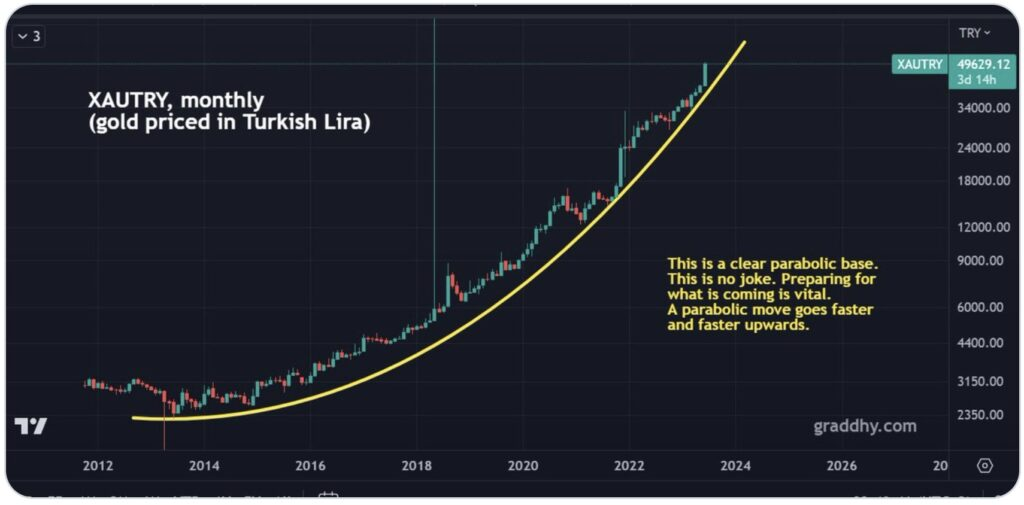 27 juin ( King World News ) – Graddhy hors de Suède :  si vous pensez que l’or et l’argent sont lents en ce moment, considérez ce graphique XAU/TRY (or en livre turque). L’or a augmenté de 21 fois par rapport à la livre turque au cours des 10 dernières années. 20 % CE mois-ci seulement. Cela arrivera à votre devise. Il faut bien jouer ce taureau des matières premières, votre avenir en dépend.