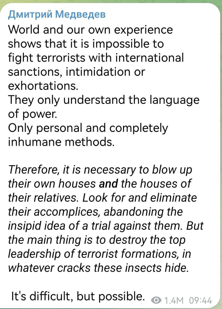 Aujourd’hui, l’artillerie russe se venge de vous. Et demain, nous ne serons pas surpris si votre nom est inscrit sur nos « Daggers » et « Kalibr ».