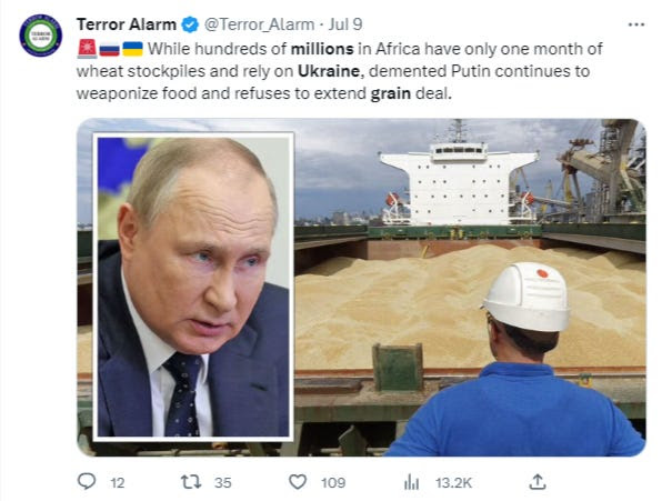 Notez comment ils tentent de recadrer le retrait comme s’articulant autour des plaintes de la Russie selon lesquelles ses propres exportations de céréales seraient « affectées » par les sanctions occidentales. C’est incroyable qu’un jour après qu’un attentat terroriste d’une telle envergure qui a fait exploser deux civils et envoyé une jeune fille dans le coma soit maintenant complètement ignoré par la presse jaune standard, les mensonges par omission.