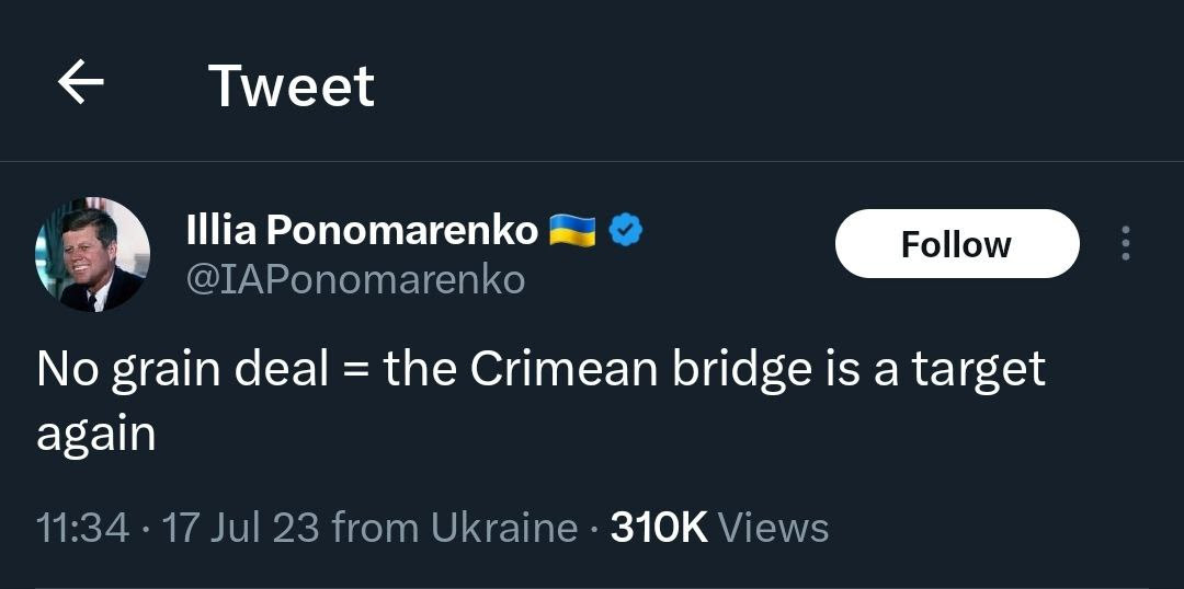 L’Ukraine, pour sa part, affirme que la fin de l’accord sur les céréales signifie que le pont de Kertch sera ciblé. Par exemple, Ponomarenko du Kiev Post :