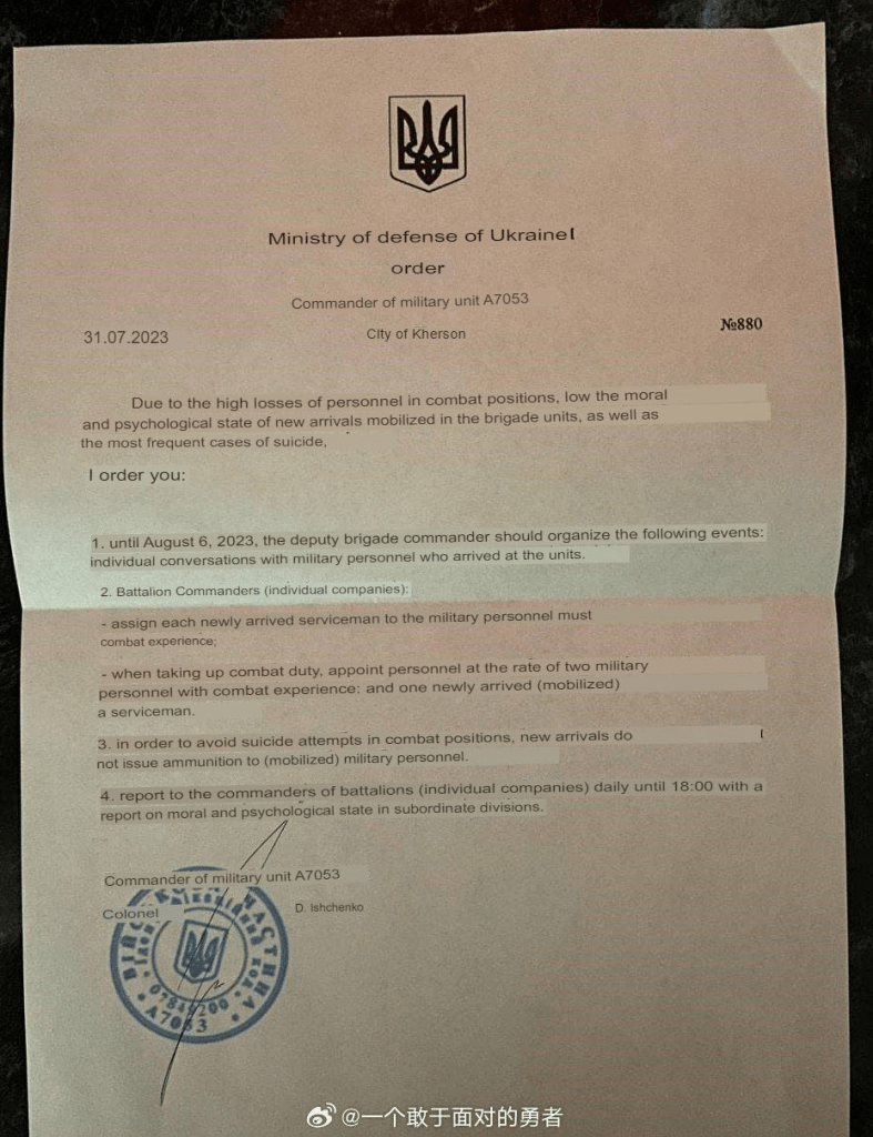 C’est intéressant car le suicide est devenu si répandu dans les rangs de l’AFU que nous avons un nouveau document divulgué d’un ordre du ministère de la Défense d’arrêter immédiatement l’approvisionnement en munitions des nouvelles recrues afin de les empêcher de se suicider en masse :