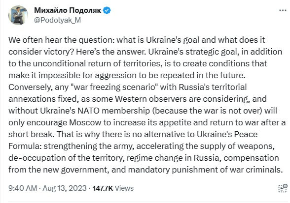 Le conseiller présidentiel Podolyak emboîte le pas et dit que l’Ukraine ne s’arrêtera pas tant qu’elle n’aura pas rendu ses territoires, mais tant qu’elle n’aura pas obtenu un « changement de régime » en Russie :