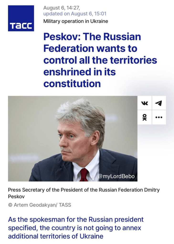 Dans l’article, Peskov déclare spécifiquement que la Russie ne veut plus annexer de nouveaux territoires :