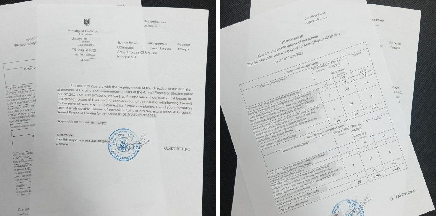 L’information suivante est un document qui a été divulgué et qui montre les pertes de la 5e brigade d’assaut séparée ukrainienne de la période du 1er janvier 2023 au 31 juillet 2023 :