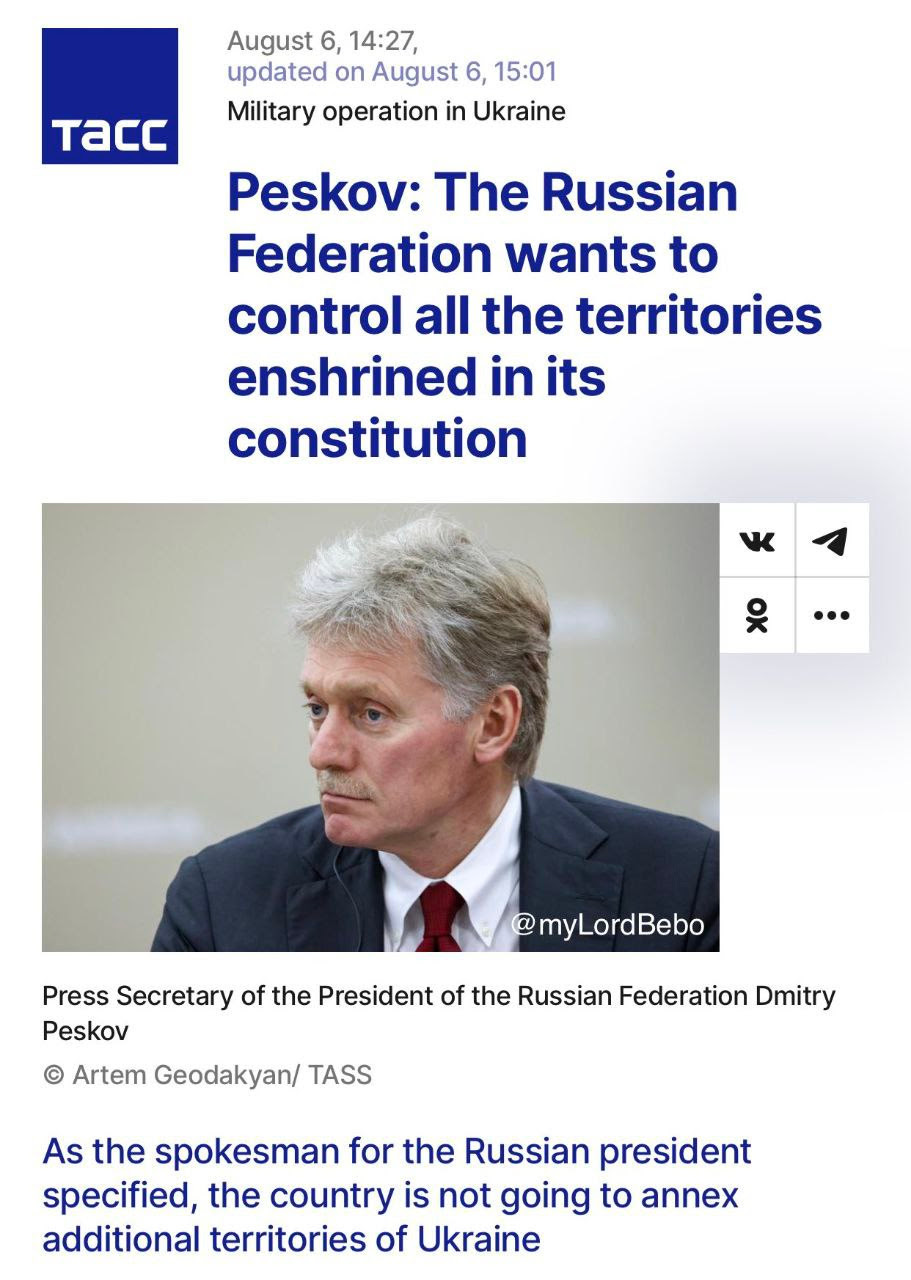 Dans l’article, Peskov déclare spécifiquement que la Russie ne veut plus annexer de nouveaux territoires :