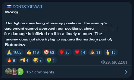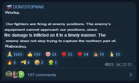 Ils ont pénétré jusqu’à Rabotino et ont finalement obligé les forces russes à l’abandonner. Cependant, la Russie en a ensuite repris une partie avec une petite contre-attaque. Au moment d’écrire ces lignes, certaines sources affirment que la Russie est présente dans le sud de la colonie, mais cela reste incertain. En fait, la chaîne DontStopWar associée à une véritable unité militaire russe semble affirmer que l’AFU n’a même pas encore capturé la partie nord de Rabotino :