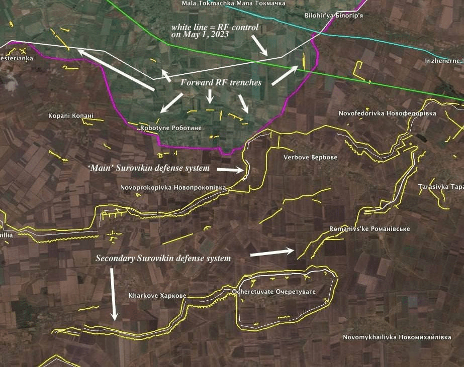 Vous pouvez voir que la célèbre « ligne de défense Surovikin » de la Russie commence beaucoup plus près que sur la corniche de Vremevske, à l’est. Cela signifie que l’Ukraine en est très proche, près de la ville de Verbove. Cependant, ici, la Russie possède beaucoup plus de couches de la ligne Surovikin, tandis qu’à l’est, sous Staromayorsk, la ligne peut commencer beaucoup plus au sud, mais il y a moins de couches d’échelons.