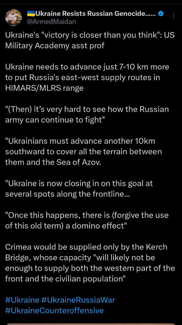 Il avait été précédemment déclaré que le principal objectif de la contre-offensive avait été réduit à la simple prise de Tokmak, plutôt qu’aux objectifs irréalistes de capturer la Crimée, Marioupol ou même Melitopol. S’ils parviennent à prendre Tokmak, ils seront heureux et considéreront cela comme un succès majeur.