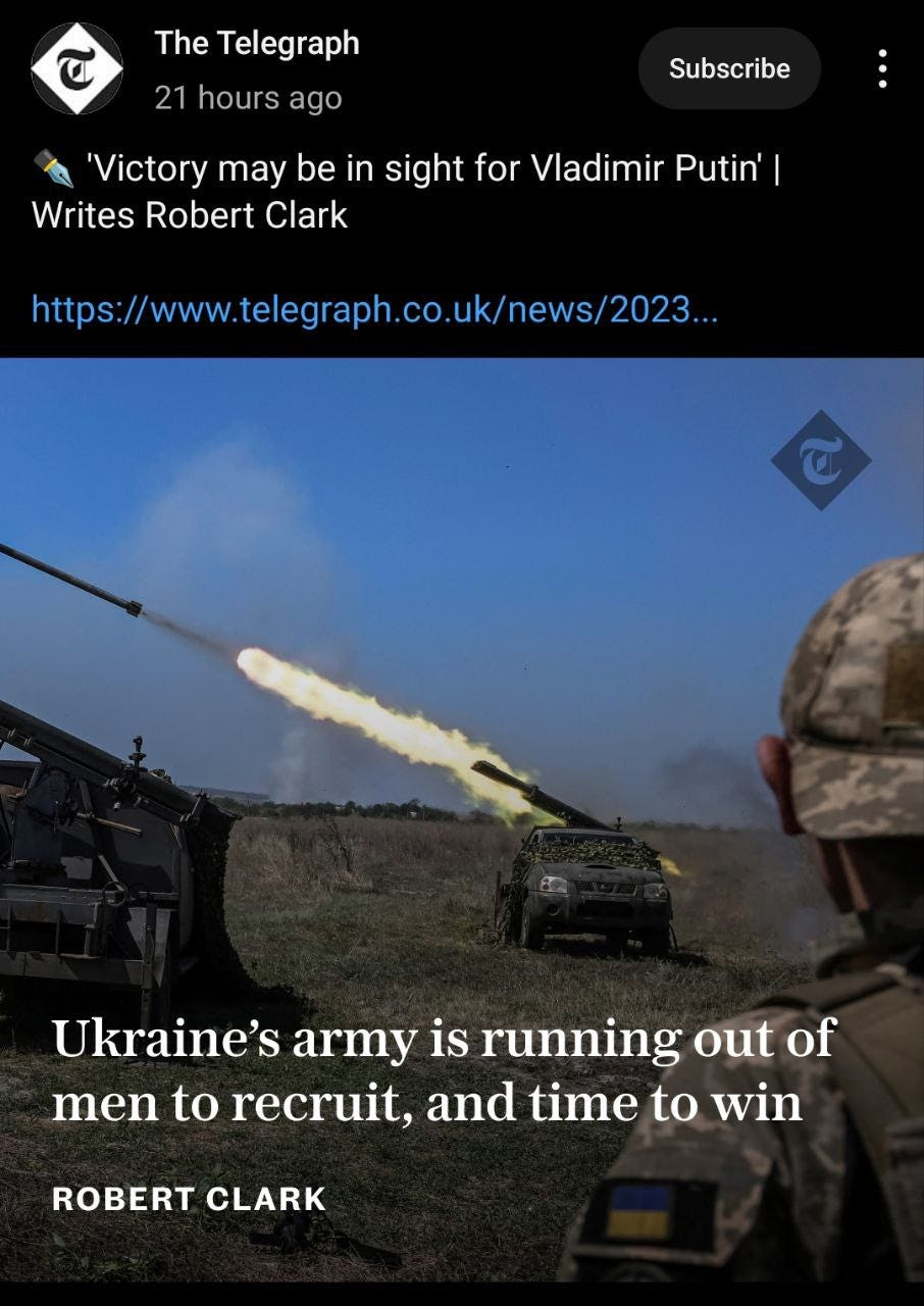L’Ukraine tentera probablement désespérément de mobiliser autant d’hommes nouveaux que possible au cours de l’hiver afin de préparer les grandes opérations russes du printemps 2024 dont tout le monde parle désormais. Mais un léger accroc dans ce plan. L’ article du WSJpublié précédemment a généré un buzz tel que RT l’a même titré :