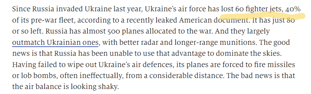 Cette dernière partie est cruciale : il admet clairement qu’ils ont perdu au moins plus de 128 chasseurs qui doivent être remplacés. En utilisant les chiffres ridicules d’Oryx, voici ce que The Economist estime que l’Ukraine a perdu :