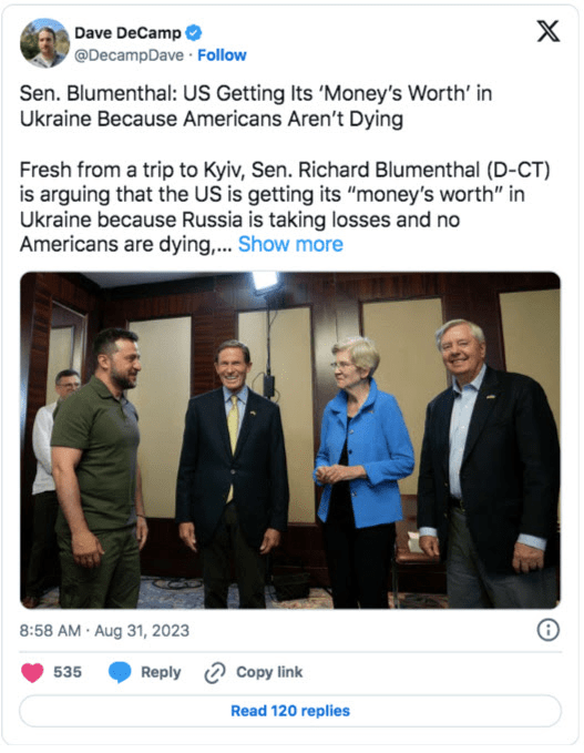 Dans un article récent du Connecticut Post , le sénateur Richard Blumenthal a assuré aux Américains que « nous en avons pour notre argent en investissant en Ukraine ».